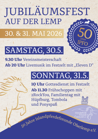 Die Islandpferde Freunde Oberlemp e.V. feiern im Jahr 2026 ihr 50-jähriges Jubiläum! Wir freuen uns darauf, Ende Mai auf dem Kälberberg gemeinsam mit Mitgliedern und Gästen an zwei Tagen mit Ponys, Musik und jeder Menge Spaß den Verein zu feiern. Also save the Date und sei unbedingt dabei!
