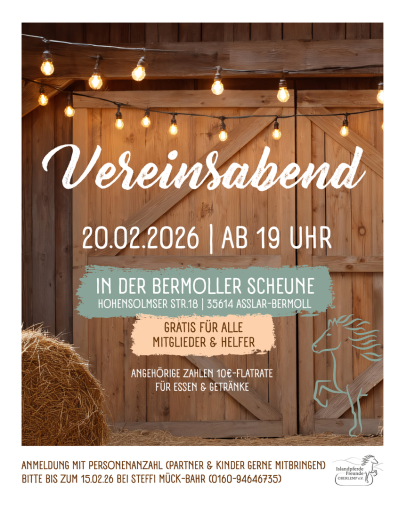 Herzliche Einladung zum Vereinsabend an alle Mitglieder, Helfer und Angehörigen. Wir wollen gemeinsam in der Bermoller Scheune einen geselligen Abend verbringen. Infos zur Anmeldung bitte dem Flyer entnehmen.